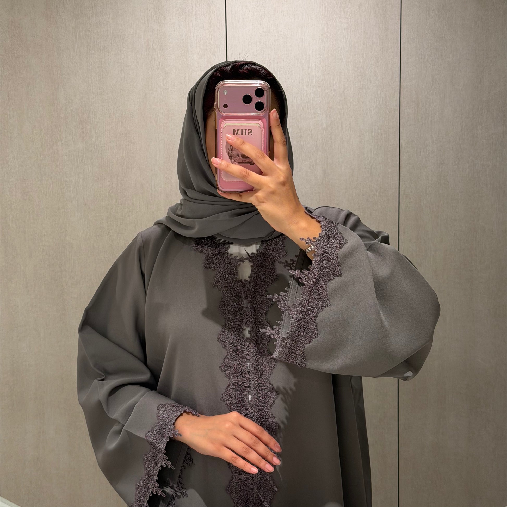A dantel abaya with grey fabric.
